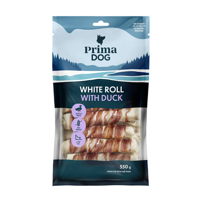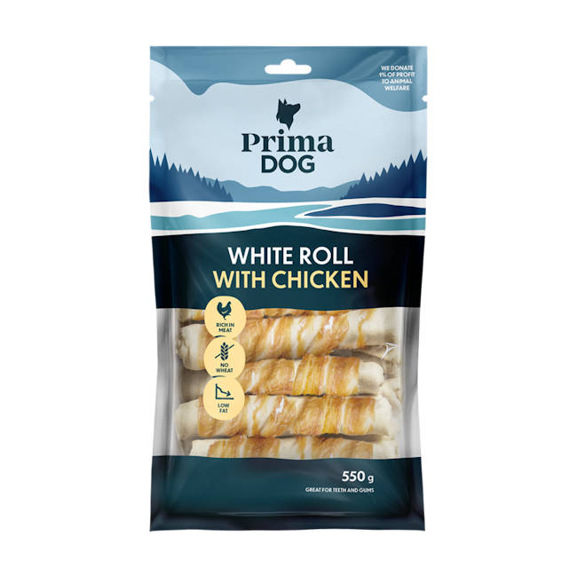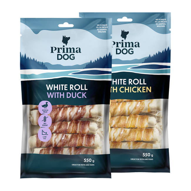 White Roll fra PrimaDog er en velsmagende tyggepind med lækkert kød omkring - vælg mellem And eller Kylling. Gode som beløning og gode for tænderne. Aktiverer hunden og tilfredsstiller dens tyggeinstinkt.